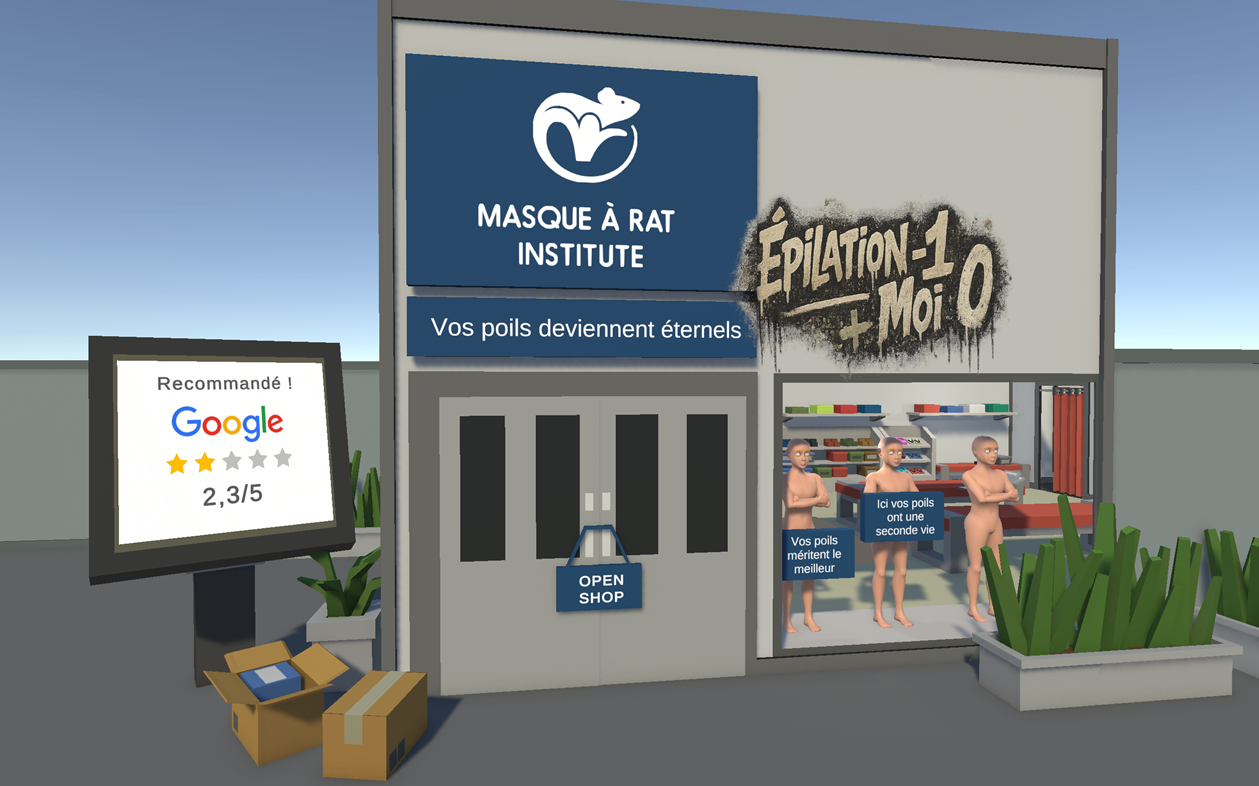 Dans ce jeu décalé, vous reprenez un salon d’esthétique plombé par une note Google désastreuse de 2,3/5. Votre objectif : remonter la réputation de l’établissement grâce à une technique aussi improbable qu’efficace… l’épilation au scotch de masquage.